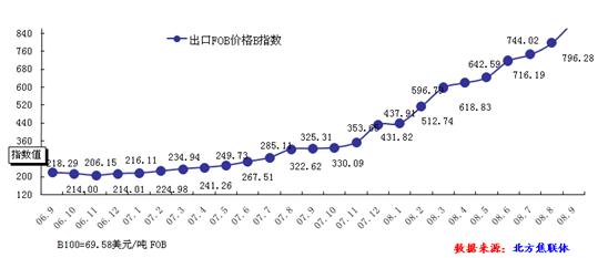 9月份焦炭出口市場(chǎng)仍然呈現(xiàn)較大的出口量,而出口均價(jià)也是繼續(xù)上揚(yáng)。9月份出口137萬(wàn)噸,均離岸價(jià)已突破600美元,再創(chuàng)歷史新高,主要原因是由于國(guó)際市場(chǎng)對(duì)中國(guó)的焦炭較為依賴,雖然國(guó)際鋼材市場(chǎng)進(jìn)入淡季,但是對(duì)中國(guó)焦炭的需求沒(méi)有大幅的減少,因此焦炭出口市場(chǎng)仍然表現(xiàn)較好。參考圖8: