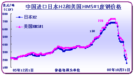 10月份國際廢鋼市場跌幅超過中國,粗略統(tǒng)計(jì),國內(nèi)廢鋼價(jià)格月末較月初跌幅46.3%,而國際市場,日本H2號廢鋼CIF到中國主要港口跌幅58%,美國破碎料CIF到中國主要港口跌幅42.5%,報(bào)價(jià)230美元/噸,但實(shí)際成交價(jià)格已經(jīng)在200美元/噸以內(nèi)。