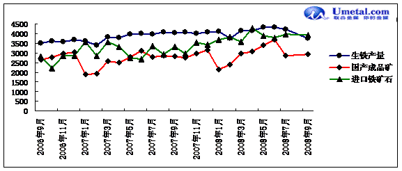 統(tǒng)計顯示,2008年9月中國生鐵產(chǎn)量3754萬噸,比8月下降6%,全國9月日均生鐵產(chǎn)量125萬噸,是2007年3月以來17個月的最低點,與2007年9月相比則下降幅度達到7%,是繼8月首次負增長之后,連續(xù)第二個月負增長。