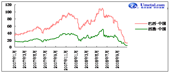 【印度調(diào)整鐵礦石出口關(guān)稅】 印度政府10月30日宣布調(diào)整鐵礦石出口關(guān)稅,粉礦關(guān)稅由原先的15%,調(diào)整為固定關(guān)稅200盧比/噸(折合4.5美元/噸),而出口比重小的塊礦出口關(guān)稅未變,仍保持15%。