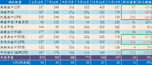 從國際價差來看,11月份國際價差較10月有所減小。從表1熱軋板卷的數(shù)據(jù)可看出,除韓國、日本、拉美和獨聯(lián)體市場外,其它主要國際市場11月份的熱軋板卷的國際價差較10月份大幅減少。這主要是由于近一個月歐美地區(qū)經(jīng)濟形勢持續(xù)惡化,鋼材價格仍舊保持下跌趨勢,而同期我國鋼材價格處于盤整狀態(tài),導(dǎo)致價差大幅縮小。在歐美地區(qū)經(jīng)濟出現(xiàn)好轉(zhuǎn)的跡象前,這種趨勢有可能會延續(xù)。因此,此時調(diào)整鋼材出口關(guān)稅有助于保持國際市場上我國鋼鐵產(chǎn)品的價格優(yōu)勢。