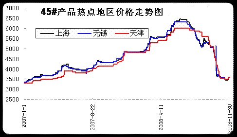 圖:2007年1月-2008年11月熱點(diǎn)地區(qū)45#碳結(jié)鋼價(jià)格走勢圖