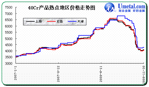 圖:2007年1月-2008年11月熱點(diǎn)地區(qū)40Cr合結(jié)鋼價(jià)格走勢圖