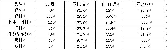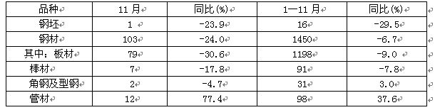 進口小幅下降。據(jù)海關(guān)統(tǒng)計,11月份全國進口鋼材103萬噸,環(huán)比下降10.4%,同比下降24%;進口鋼坯1萬噸,同比下降23.9%。今年1—11月份累計,進口鋼材1450萬噸,比去年同期下降6.7%。
