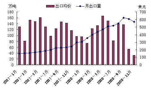 圖1 焦炭月出口量及均價格走勢圖