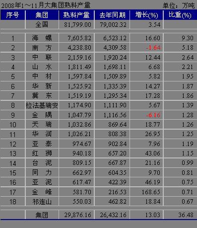 2008年1~11月全國(guó)水泥大集團(tuán)熟料產(chǎn)量統(tǒng)計(jì)
