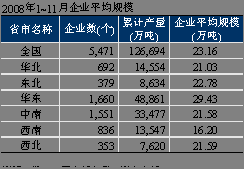 總產(chǎn)量增速趨緩,而企業(yè)數(shù)目的增多,使水泥企業(yè)平均規(guī)模略有下降。1~11月,全國企業(yè)平均規(guī)模為23.16萬噸,較2007年同期下降了0.54個百分點(diǎn)。除華東地區(qū)水泥企業(yè)平均高于全國平均水平外(1~11月為29.43萬噸),其他五大區(qū)域的企業(yè)規(guī)模均小于全國平均水平,以西南地區(qū)最為明顯,僅為16.20萬噸。
