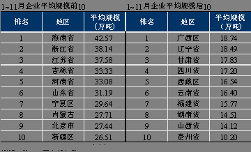 但區(qū)域內(nèi)具有極大分化:華東的浙江、江蘇和山東三省入圍前10,而福建省的平均規(guī)模卻為全國倒數(shù)第四位;中南的海南平均規(guī)模居全國首位,河南為第4位,而廣西、湖南、山西的平均規(guī)模在全國排名后10之列;華北、西北企業(yè)平均規(guī)模較大,內(nèi)蒙古、北京,寧夏、新疆入圍前10;西南地區(qū)企業(yè)平均規(guī)模普遍較小,除重慶外,四川、西藏、云南、貴州四省均進(jìn)入全國平均規(guī)模后10。