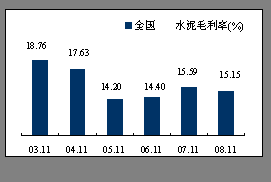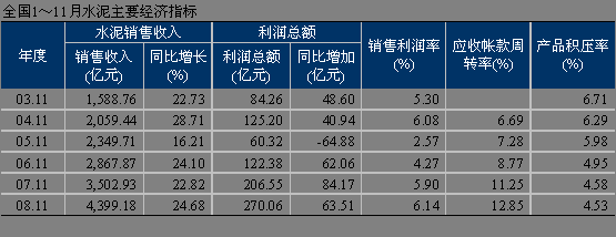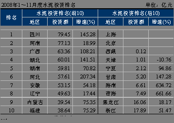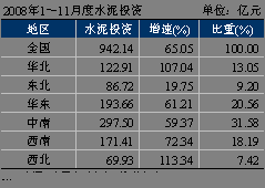 由于2006和2007年水泥市場偏暖,使2008年水泥投資持續(xù)走高。1~11月水泥產(chǎn)業(yè)投資完成942.14億元,同比增長65.05%。