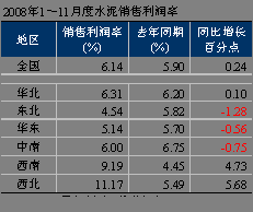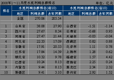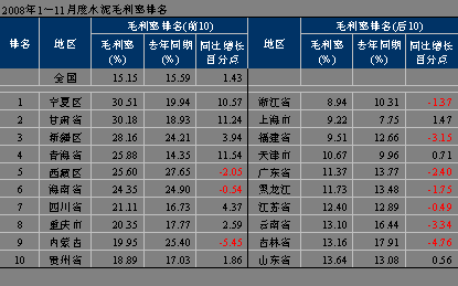 1~11月全國水泥銷售毛利率為15.15%,和2007年基本持平?梢哉f,今年煤炭、燃油成本的大幅上漲被消化,轉(zhuǎn)移到下游產(chǎn)業(yè);經(jīng)濟(jì)形勢下挫仍然沒有阻止水泥產(chǎn)業(yè)盈利能力提高的腳步。毛利率排名前10中,除海南、內(nèi)蒙古外,都分布在西北和西南;排名后10個地區(qū)中,華東地區(qū)占了5個。