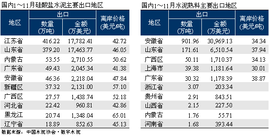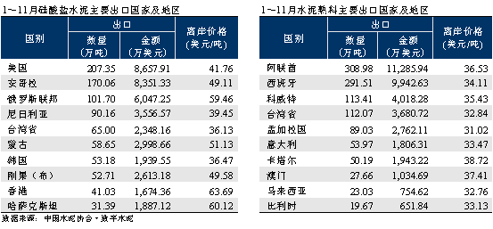 我國水泥出口地區(qū)主要是美國、非洲、俄羅斯和周邊國家地區(qū),美國仍然是我國最大的水泥出口國,但比2007年同期相比減少了近300萬噸;俄羅斯今年從我國水泥進(jìn)口量急劇增加。熟料出口方面,1~11月份,我國向阿聯(lián)酋出口的熟料達(dá)到287.04萬噸,已超過西班牙,躍居第一位;西班牙在國內(nèi)新建生產(chǎn)線的投產(chǎn),使今年向其熟料出口急劇下降,與2007年同期相比,減少了近500萬噸。