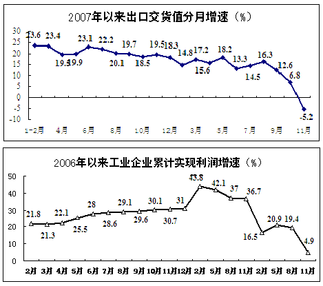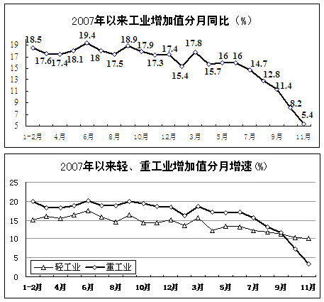 工業(yè)生產增速大幅下滑。11月份,規(guī)模以上工業(yè)增加值同比增長5.4%,為1998年公布該指標以來月度增速最低值(剔除春節(jié)因素),增速比上月減緩2.8個百分點,同比減緩11.9個百分點。1-11月,規(guī)模以上工業(yè)增加值累計增長13.7%,同比減緩4.8個百分點。