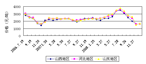 2006年,我國煤焦油價格變化幅度較大,6月份煤焦油上漲到3000元/噸;然后一路下滑,11月份煤焦油價格跌至最低點,為1400元 /噸;而后煤焦油價格開始上漲,12月份煤焦油價格為2100元/噸。進入2007年,煤焦油價格借06年年底上漲之勢,全年穩(wěn)定在2300元/噸。 2008年,煤焦油價格一路飆升,從2300元/噸漲至7月份的3500元/噸,有的地方甚至達到了4000元/噸,而后煤焦油價格開始下跌,截止12月 20日,山西省煤焦油價格已經(jīng)跌至1600元/噸。山西省、河北省、山東省煤焦油價格走勢見圖3-1。