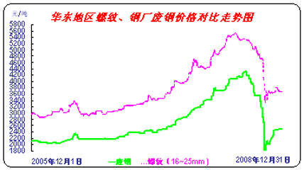 圖2可見(jiàn),08年國(guó)內(nèi)廢鋼價(jià)格與螺紋鋼基本同一步調(diào),單單考慮價(jià)格波動(dòng)幅度,廢鋼59%的下滑更高于鋼材,同時(shí)過(guò)分的下滑也造就了后期的理性回溫態(tài)勢(shì)。而圖中螺紋鋼的價(jià)格走勢(shì),12月份小幅向下震蕩,但筆者對(duì)元旦后幾天的市場(chǎng)看法,可能出現(xiàn)短期的價(jià)格凸?jié)q現(xiàn)象,主要為經(jīng)銷(xiāo)商炒作造成,春節(jié)前的價(jià)格固定,有利于節(jié)后掌控市場(chǎng)。但用鋼企業(yè)市場(chǎng)情況依舊低迷,加上11-12月份鋼廠的產(chǎn)能恢復(fù),目前來(lái)看,鋼廠庫(kù)存尚未有效轉(zhuǎn)移到社會(huì)庫(kù)存,春節(jié)后國(guó)內(nèi)建材市場(chǎng)短期內(nèi)很難看到明顯回溫。但元旦后建材的凸?jié)q,加上稅改政策執(zhí)行,足以使國(guó)內(nèi)廢鋼在春節(jié)前再經(jīng)歷一次普漲,鋼廠含稅收購(gòu)廢鋼價(jià)格上漲幅度可能接近300元/噸,但扣除增稅,實(shí)際價(jià)格上漲幅度在150元/噸左右。