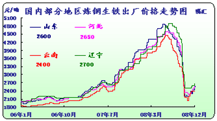 08年國(guó)內(nèi)煉鋼生鐵價(jià)格走勢(shì)與廢鋼基本同步,同樣經(jīng)歷大起大落,上半年受節(jié)能減排、奧運(yùn)因素、鋼廠需求拉動(dòng),市場(chǎng)資源持續(xù)緊張,鐵廠多數(shù)零庫(kù)存運(yùn)行,價(jià)格一路上漲,上半年個(gè)別地區(qū)煉鋼生鐵市場(chǎng)價(jià)格突破5000元/噸。用久漲必跌來(lái)描述接下來(lái)的市場(chǎng)運(yùn)行態(tài)勢(shì),顯得十分貼切,因上半年我國(guó)鋼鐵產(chǎn)業(yè)告訴發(fā)展,完全忘記了用戶(hù)的消費(fèi)承受能力,以至于在經(jīng)濟(jì)危機(jī)的刺激下,鋼鐵產(chǎn)業(yè)開(kāi)始滑坡,絕大部分鋼鐵產(chǎn)品都經(jīng)歷了有史以來(lái)罕見(jiàn)的大幅度下滑,生鐵也是如此,市場(chǎng)充滿(mǎn)觀望的氣氛。不過(guò)隨著持續(xù)停爐帶來(lái)的資源緊張,鋼材復(fù)蘇,廢鋼漲價(jià)等因素影響,國(guó)內(nèi)生鐵市場(chǎng)開(kāi)始回溫上漲,但煉鋼生鐵品如其名,完全用于煉鋼中,在大環(huán)境沒(méi)有復(fù)蘇、鋼材價(jià)格沒(méi)有明顯上漲的前提下,煉鋼生鐵市場(chǎng)價(jià)格只能區(qū)域內(nèi)小幅波動(dòng),