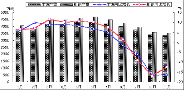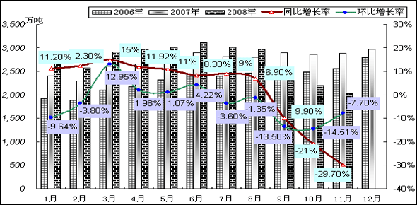 盤點(diǎn)2008年中國(guó)焦炭市場(chǎng),大體上可以劃分為“快速上行”與“急轉(zhuǎn)直下”兩個(gè)階段。從需求面看:據(jù)國(guó)家統(tǒng)計(jì)局官方發(fā)布的統(tǒng)計(jì)數(shù)據(jù)顯示,截止到11月份,全國(guó)粗鋼、生鐵產(chǎn)量分別為46296萬(wàn)噸和43414萬(wàn)噸,同比增長(zhǎng)率分別為2.6%和1%。其中,2008年前兩個(gè)季度,消費(fèi)焦炭占全國(guó)焦炭消費(fèi)總量近90%的粗鋼、生鐵產(chǎn)量分別達(dá)到了26319.5萬(wàn)噸和24642萬(wàn)噸,同比分別增長(zhǎng)9.6%和7.9%。但是,2008年7-11月份,粗鋼、生鐵產(chǎn)量?jī)H達(dá)到19815.8萬(wàn)噸和18721.8萬(wàn)噸,同比增長(zhǎng)率分別為-4.8%和-6.7%。因此,在上半年鋼鐵生產(chǎn)持續(xù)快速增長(zhǎng)的拉動(dòng)下,焦炭需求異常旺盛,價(jià)格更是高歌猛進(jìn)、逐月猛漲。然而進(jìn)入8月份以后,鋼材市場(chǎng)開始逐漸疲軟,加上美國(guó)金融危機(jī)的爆發(fā),全國(guó)鋼鐵生產(chǎn)陷入了限產(chǎn)與停產(chǎn)的泥淖,進(jìn)而縮減了對(duì)焦炭產(chǎn)品的需求。從2008年前11個(gè)月粗鋼、生鐵產(chǎn)量的月度對(duì)比數(shù)據(jù)來(lái)看,單月產(chǎn)量在年中達(dá)到峰值后急轉(zhuǎn)直下,見圖1.