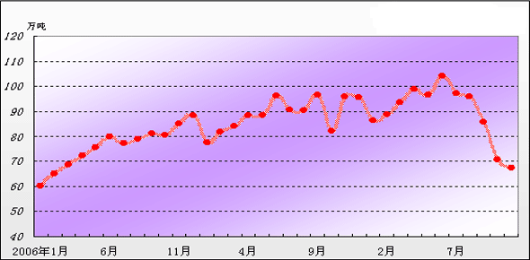 圖2 2006-2008年我國(guó)焦炭產(chǎn)量對(duì)比走勢(shì)圖