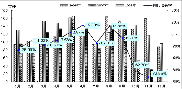 圖4 2006-2008年全國(guó)焦炭月出口量對(duì)比走勢(shì)圖
