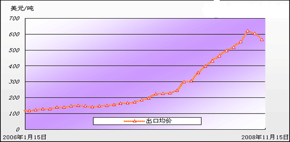 截止到2008年11月份,全國(guó)累計(jì)出口焦炭1190萬(wàn)噸,同比減少243萬(wàn)噸,下降16.9%;總計(jì)出口金額57.11億美元,同比增長(zhǎng)106.7%。從全年中國(guó)焦炭的月出口均價(jià)來(lái)看,從2007年下半年以來(lái),我國(guó)焦炭出口價(jià)格呈爬坡狀節(jié)節(jié)攀升,進(jìn)入2008年以后,焦炭出口均價(jià)更是一路上漲到9月份的621.32美元噸,并在隨后的幾個(gè)月里持續(xù)回落,見圖5.