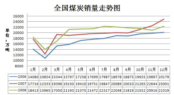 2008年全國(guó)煤炭銷(xiāo)量走勢(shì)