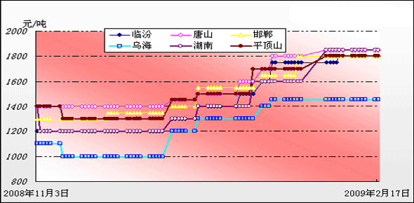 今日,中南地區(qū)多家鋼廠表示:從17號開始,將焦炭采購價格全部下調(diào)50元/噸。春節(jié)后,持續(xù)回升的價格讓國內(nèi)焦炭市場呈現(xiàn)出一派欣欣向榮的景象,而此時,做為焦炭消費(fèi)大戶的鋼鐵企業(yè)卻并沒有那么樂觀,因?yàn)榫驮诖汗?jié)后的第二周,多個品種的鋼材價格相繼回落。 去年底,在國家連續(xù)出臺“利好政策”的刺激下,之前一直處于減產(chǎn)狀態(tài)的鋼鐵企業(yè)開始陸續(xù)提產(chǎn)、甚至是復(fù)產(chǎn)。因此,在一定程度上提升了對鋼鐵原燃料的消費(fèi)需求,加上春節(jié)期間小煤礦的停產(chǎn)因素,使得焦煤、焦炭的市場供應(yīng)明顯偏緊,價格節(jié)節(jié)攀升。 根據(jù)聯(lián)合金屬網(wǎng)監(jiān)測的焦炭價格數(shù)據(jù)顯示:國內(nèi)焦炭價格從去年11月份開始觸底反彈,經(jīng)過連續(xù)三月的上漲,2月初,國內(nèi)一級冶金焦價格已經(jīng)接近2000元/噸,二級冶金焦價格保持在1800元/噸左右。