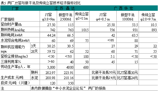 根據(jù)新型半干法JT窯水泥生產(chǎn)技術(shù)的特點,它的技術(shù)定位是適合中小水泥企業(yè)的先進技術(shù)。不是與大型經(jīng)濟規(guī)模新型干法的競爭技術(shù),而是新型干法技術(shù)的補充。因為新型干法技術(shù)是大型化技術(shù),生產(chǎn)水平受生產(chǎn)線規(guī)模制約,2000t/d以下生產(chǎn)線的技術(shù)經(jīng)濟指標(biāo)并不先進,因此不適合中小水泥企業(yè)。新型半干法JT窯水泥生產(chǎn)技術(shù)正好適合600~1500t/d規(guī)模,填補了新型干法技術(shù)不適合中小水泥企業(yè)的技術(shù)空白,也為水泥工業(yè)產(chǎn)業(yè)政策提供了中小水泥企業(yè)的支撐技術(shù)。通過江蘇磊達、廣西華宏既有新型干法生產(chǎn)線,又有JT窯生產(chǎn)線兩廠的生產(chǎn)實踐,有力的證明了新型半干法水泥生產(chǎn)技術(shù),是適用于中小水泥企業(yè)的先進技術(shù),F(xiàn)將兩廠實際生產(chǎn)技術(shù)經(jīng)濟指標(biāo)能列入表5:
