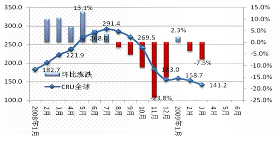 從CRU綜合鋼材價格指數(shù)變化情況看,至今年3月中下旬,CRU綜合鋼材價格指數(shù)已降至141.2點,比去年最高的291.4點(7月)累計下跌了51.5%。并且自去年8月份至11月份,連續(xù)4個月環(huán)比跌幅呈持續(xù)擴大的態(tài)勢,至去年的11月份,單月環(huán)比跌幅達23.8%。自去年12月至今年2月份,價格環(huán)比跌幅一度呈縮小的態(tài)勢,今年3月份,CRU國際鋼材綜合價格指數(shù)跌幅又有所擴大。不管怎樣,國際鋼價深度下跌的時期應(yīng)經(jīng)渡過,今年以來鋼價雖繼續(xù)下跌,但幅度呈縮小的態(tài)勢。盡管如此我們也還不能列出鋼價觸底反彈的時間表。