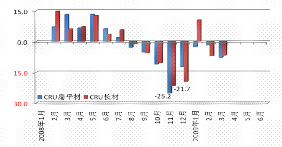 1、從大品種上看,CRU國際市場長材、扁平材價格指數(shù)均大幅下跌,但長材價格較為活躍,扁平材跌幅相對較深。去年11月份是長材、扁平材價格下跌最為明顯的時期,扁平材價格指數(shù)下跌了25.2個百分點,長材下跌21.7個百分點,扁平材跌幅比長材高3.5個百分點。值得注意的是1月份長材價格曾大幅回升,主要是受亞洲市場鋼筋、線材等建筑用鋼材的補庫因素的影響,實際需求增長有限。