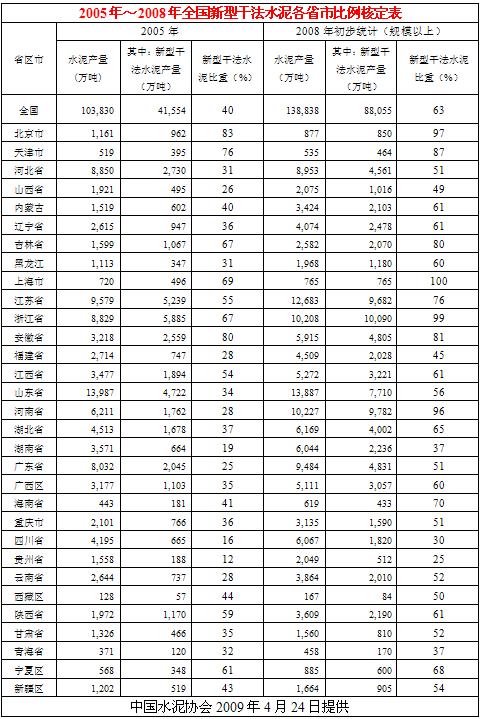 2009年4月中國水泥協(xié)會經(jīng)過與各省市自治區(qū)協(xié)會、行管辦及部分大企業(yè)逐一核對,初步完成截止2008年底,各省市自治區(qū)新型干法水泥比重表。