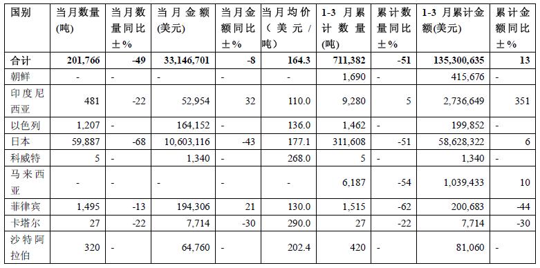 2009年3月無煙煤出口分國別統(tǒng)計