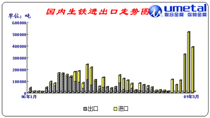 09年5月我國(guó)出口生鐵1439.49噸,比4月的519.34噸增加了920.15噸,環(huán)比增長(zhǎng)177.18%,全部出口至韓國(guó),由吉林地區(qū)出口。