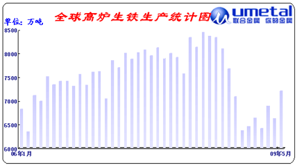 09年5月全球40個(gè)主要生鐵生產(chǎn)國(guó)共產(chǎn)生鐵7212.1萬(wàn)噸,較4月份的6630.9萬(wàn)噸增加了581.2萬(wàn)噸,環(huán)比增長(zhǎng)8.77%。5月日均產(chǎn)量為232.65萬(wàn)噸,較4月份的221.03萬(wàn)噸相比略有增加。09年1-5月40國(guó)高爐生鐵總產(chǎn)量33788.6萬(wàn)噸,與去年同期的40404.6萬(wàn)噸相比減少了6616萬(wàn)噸,同比下降16.37%