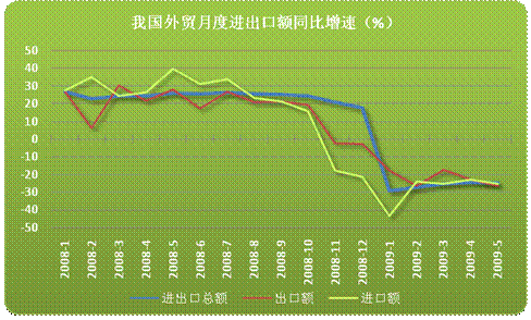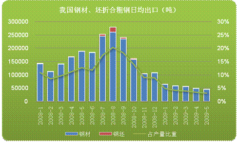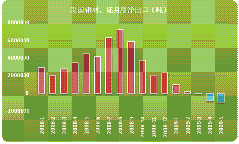 面臨全球性經(jīng)濟衰退的大背景下,我國鋼鐵外貿(mào)出口形勢受到了極其嚴重的影響。鋼材出口量自去年8月份以來,幾乎持續(xù)9個月環(huán)比逐月下降,其直接出口所占國內(nèi)粗鋼產(chǎn)量的比重也由最高時的20.3%下降至今年5月份的3.1%,月均近350萬噸的粗鋼產(chǎn)量由去年的出口轉(zhuǎn)為今年的內(nèi)銷。