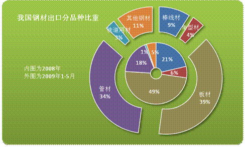 2009年我國鋼材出口品種結(jié)構(gòu)變化明顯,隨政策性調(diào)整的趨勢突出。09年管材的出口表現(xiàn)異軍突起,其他產(chǎn)品1-5月的累計出口同比均表現(xiàn)為80%左右的負增長,而管材則僅僅下降了21.7%,另出口金額還同比增長了1.4%。這種表現(xiàn)在當前國際需求慘淡的市場條件下實屬難得,也與我國出口政策存在莫大的關聯(lián)。因為管材的優(yōu)異成績?nèi)〉弥饕靡嬗谑吞烊粴獾篮腹艿谋憩F(xiàn),而此種產(chǎn)品一直擁有13%的高額退稅率。