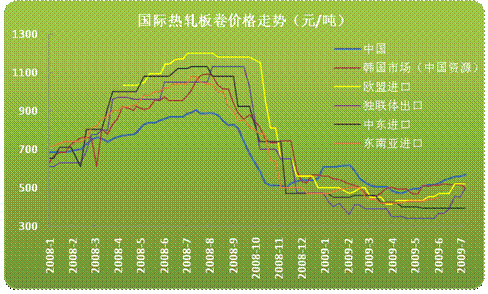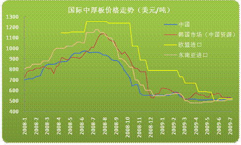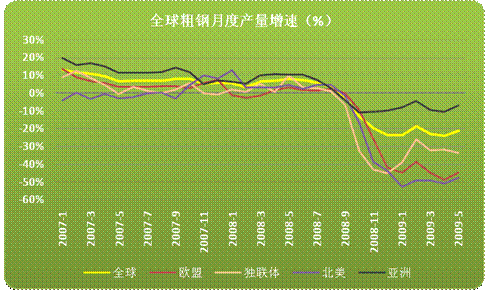 在經(jīng)濟危機下,全球鋼鐵業(yè)的生產(chǎn)情況反應敏感。越是危機的重災區(qū),其鋼鐵產(chǎn)量下降得越明顯。歐美國家09年粗鋼產(chǎn)量基本保持在去年的一半水平,則將近有50%的產(chǎn)能被閑置。產(chǎn)量同比降幅最小的地區(qū)是亞洲,主要受到中國產(chǎn)量增長的支撐。除中國以外的亞洲其他主要鋼鐵生產(chǎn)國產(chǎn)量同比也降幅明顯,韓國前5個月產(chǎn)量同比下降17%,日本更是下降了42%。