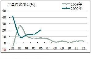 分區(qū)域看,華東地區(qū),受淡季因素影響,上海、江蘇、浙江、安徽6月產(chǎn)量環(huán)比不同程度下滑,但同比增速加快明顯。浙江省6月同比增速23.72%,比2008年同期增速提高34.31個(gè)百分點(diǎn)。中南、西南地區(qū)雖受雨水影響,但6月產(chǎn)量環(huán)比依然增長(zhǎng)。華北、東北地區(qū)6月仍處于需求旺季,尤其是華北,環(huán)比增長(zhǎng)顯著。