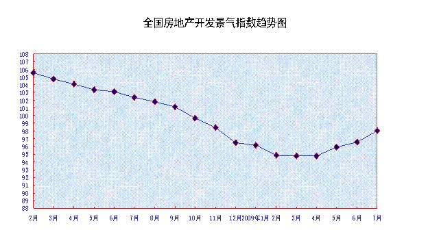 7月份,全國房地產(chǎn)開發(fā)景氣指數(shù)(簡稱“國房景氣指數(shù)”)為98.01,比6月份提高1.46點。