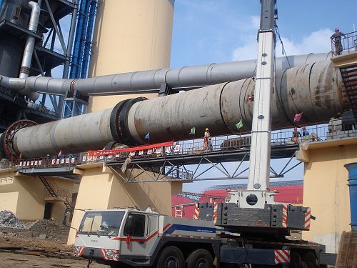 鑒于回轉(zhuǎn)窯筒體吊裝場(chǎng)地較小等實(shí)際情況,為趕搶工期,南京凱盛項(xiàng)目部制定了科學(xué)有效的施工方案,作業(yè)工段也打破以往在地面進(jìn)行部分組對(duì)的作業(yè)程序,采取從窯尾按自然段節(jié)直接吊裝的方法進(jìn)行安裝。