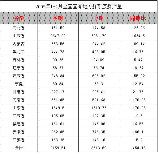 2009年1-4月全國國有地方煤礦原煤產(chǎn)量統(tǒng)計