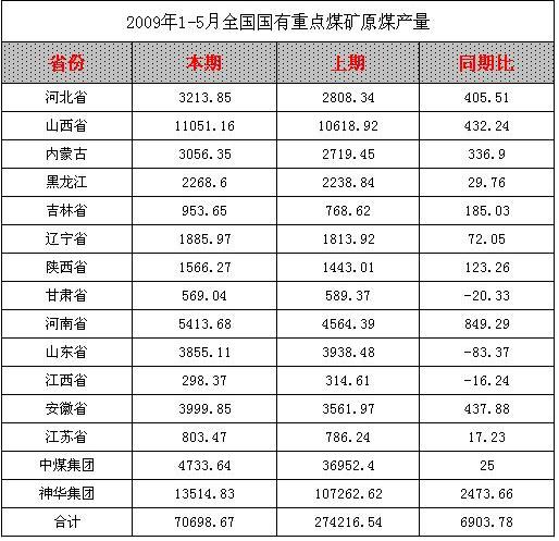 2009年1-5月全國(guó)國(guó)有重點(diǎn)煤礦原煤產(chǎn)量統(tǒng)計(jì)