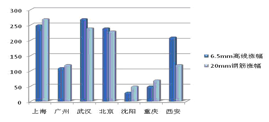 華東、中南地區(qū)長材價格漲幅最為明顯,其中:上海市場盤條和鋼筋價格分別上升了7.6%和8.3%;武漢市場盤條和鋼筋價格分別上升了7.9%和7.0%。北京地區(qū)價格上升走勢也很明顯,盤條和鋼筋價格分別上升了7.4%和6.8%。