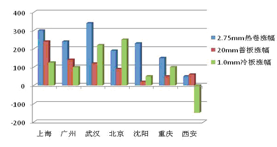 1、從品種上看,全國主要城市熱卷平均價格上升了195元/噸,平均漲幅在5.5%;其次是盤條和鋼筋,市場平均價格分別上升了115-124元/噸,平均漲幅在3.4-3.6%;中厚板平均價格也上升了2.9%;冷板價格漲幅最小,僅上升了1.9%。