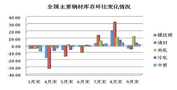 二、上半年去庫存趨勢基本結(jié)束,三季度主要鋼材品種庫存呈連續(xù)數(shù)月環(huán)比上升趨勢,這種趨勢在8月份表現(xiàn)得最為充分。9-10月板材庫存繼續(xù)增長,但長材庫存開始下降;板材中的冷板和中板升幅收窄,但熱卷庫存環(huán)比升幅還在進(jìn)一步放大。