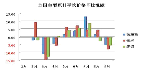 從1-9月全國主要城市原燃材料價格環(huán)比變動情況看,二季度以來成本上升的勢頭在三季度末得以逆轉(zhuǎn),主要原燃料鐵精粉、冶金焦和廢鋼等價格由升幅收窄轉(zhuǎn)變?yōu)榇蠓认陆底邉。原料價格的降低為鋼廠降低售價騰出了一定的空間。