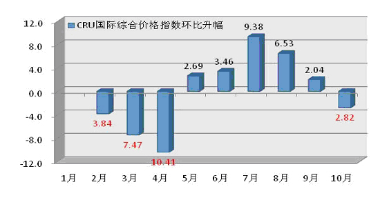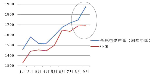 從四季度粗鋼生產(chǎn)情況看,9月份中國粗鋼日產(chǎn)量達(dá)到169萬噸,環(huán)比僅僅增長了0.1%,而去除中國因素以外的全球其他國家和地區(qū)粗鋼日產(chǎn)達(dá)到了188萬噸,環(huán)比增長年7.4%,明顯快于中國產(chǎn)量增速。實際上隨著全球粗鋼產(chǎn)量的逐步恢復(fù),國際市場鋼材價格在連續(xù)五個月環(huán)比上升后,已經(jīng)開始出現(xiàn)回落趨勢,10月份CRU綜合鋼材價格指數(shù)降至155.3點,環(huán)比下降2.82%。