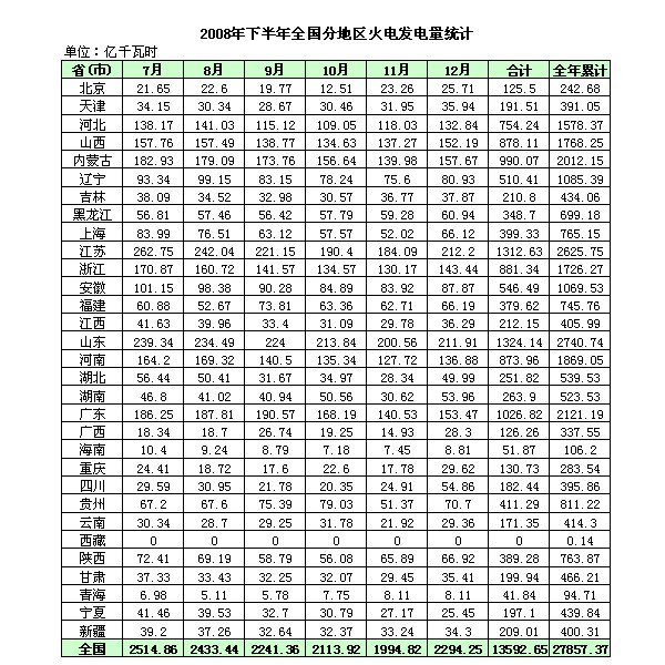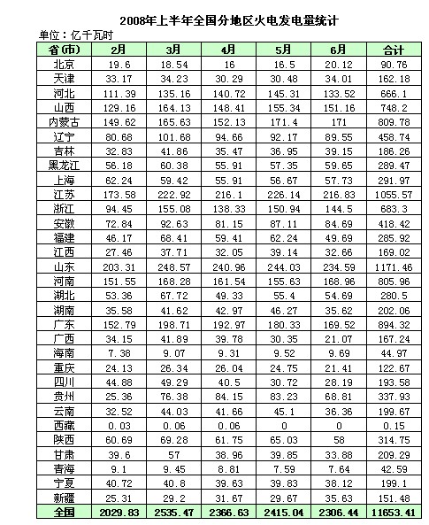2008年年全國分省市火電發(fā)電量統(tǒng)計