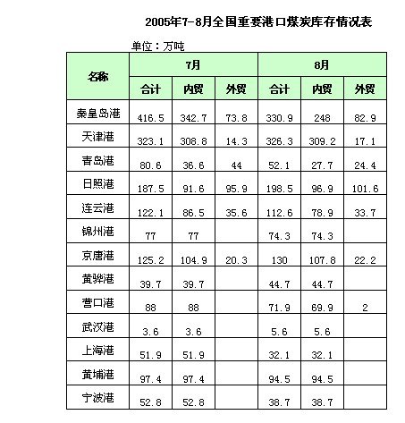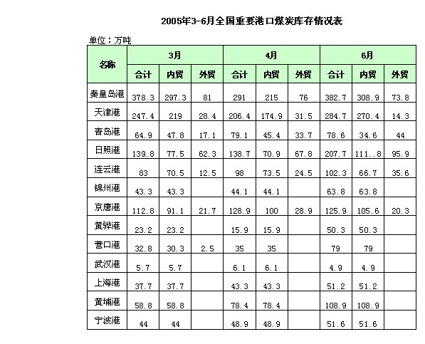 2005年全國(guó)重要港口煤炭庫(kù)存情況統(tǒng)計(jì)