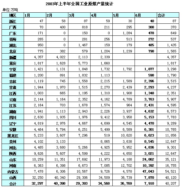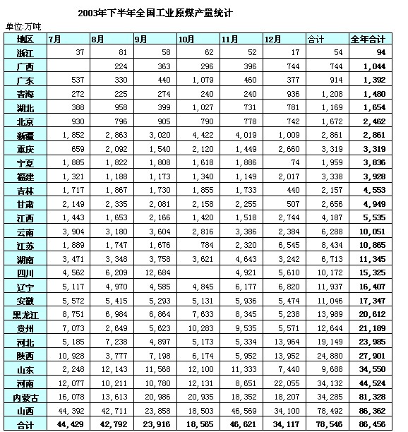 2003年全國(guó)工業(yè)原煤產(chǎn)量統(tǒng)計(jì)