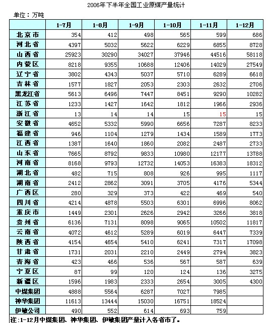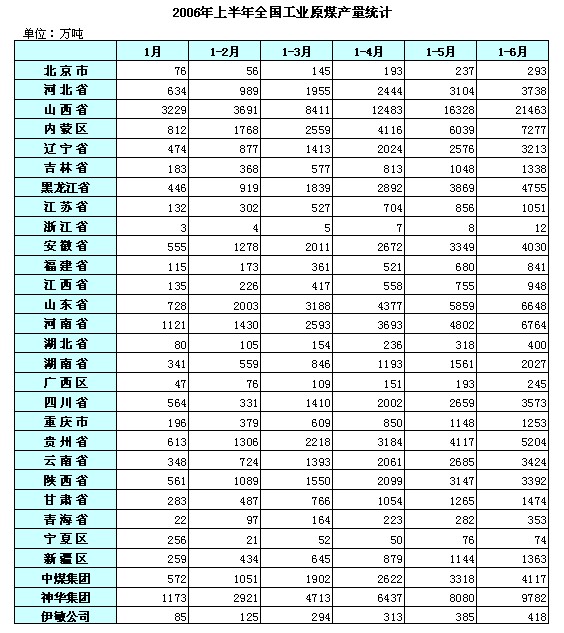 2006年全國工業(yè)原煤產(chǎn)量統(tǒng)計