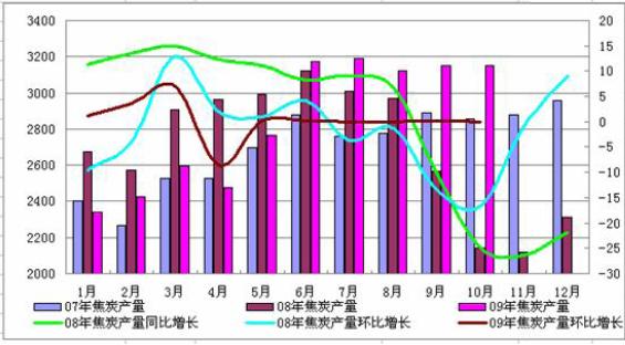 2009 年10 月中國(guó)焦炭產(chǎn)量為3153.19 萬(wàn)噸,與上月基本持平,而去年同月產(chǎn)量只有2141.38 萬(wàn)噸,同比增長(zhǎng)47.25%。10 月份的鋼材市場(chǎng)整體處于震蕩盤整運(yùn)行的態(tài)勢(shì),盡管鋼價(jià)仍有陰跌的現(xiàn)象,但是鋼廠并未有減產(chǎn)意識(shí),基本都開(kāi)足馬力生產(chǎn),10 月份粗鋼產(chǎn)量為5175 萬(wàn)噸,同比增長(zhǎng)42.4%,環(huán)比增長(zhǎng)2%,意味著焦炭的下游市場(chǎng)并沒(méi)有萎縮。因此盡管焦化行業(yè)協(xié)會(huì)建議限產(chǎn)60%,但是大部分企業(yè)并沒(méi)有執(zhí)行,滿負(fù)荷生產(chǎn)現(xiàn)象純屬普遍,產(chǎn)能過(guò),F(xiàn)象嚴(yán)重,這也是造成10 月中上旬焦炭滯銷的主要原因,盡管山西焦協(xié)建議10月份焦炭?jī)r(jià)格與上月持平,但是仍然沒(méi)有阻擋住各地焦炭?jī)r(jià)格的下行,各地焦炭?jī)r(jià)格與9月份相比都有50 元左右的下滑。1-10 月焦炭累計(jì)產(chǎn)量為2.85 億噸,去年同期產(chǎn)量2.72億噸,同比增長(zhǎng)4.8%。